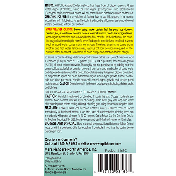 Don't let algae ruin the beauty of your pond or fountain. Choose API POND ALGAEFIX Algae Control and enjoy the rewards and relaxation of fishkeeping with confidence. Join countless fish enthusiasts who trust API products to provide a safe and hospitable environment for koi, catfish, perch, goldfish, and more. Start maintaining a pristine aquatic habitat today!