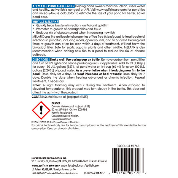 Are you concerned about the health of your beloved pond fish? Look no further than API POND MELAFIX Pond Fish Bacterial Infection Remedy. With its powerful antibacterial properties derived from tea tree extract, this incredible remedy is specifically formulated to heal bacterial infections, repair damaged fins, ulcers, and open wounds in pond fish. Experience the rapid healing and tissue re-growth that can be seen within just four days of treatment!