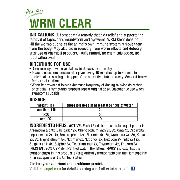 HomeoVet Avian WRM Clear 15 ML, your avian ally in the fight against worms! Give your feathered friend the care they deserve with this powerful and natural bird supplement. Designed to support the removal of tapeworms, roundworms, and eyeworms, WRM Clear doesn't just kill the invaders; it empowers your bird's immune system to expel them naturally. Say goodbye to harsh chemicals and hello to a safe, effective, and gentle homeopathic remedy suitable for birds of all ages. Witness the relief as your pet experiences freedom from symptoms like weight loss, reduced egg production, abnormal droppings, and more. With up to 90 doses per bottle, this liquid formula is not only a treatment but also a preventative measure. Plus, there are no known side effects, making it a reliable and natural choice for your avian companion's well-being.