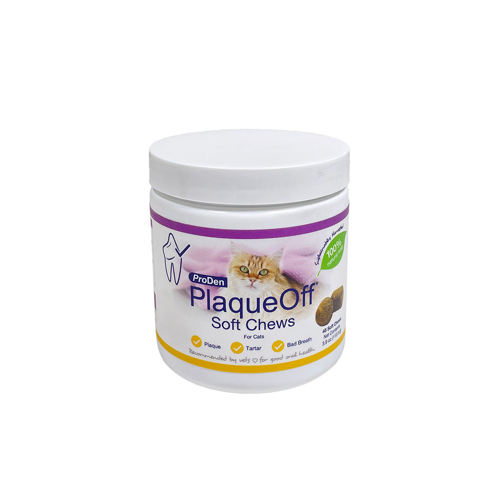 Plaque-Off Cat Soft Chew 45 CT, a breakthrough in feline dental care brought to you by ProDen PlaqueOff®. These soft chews are a delicious and convenient way to support your cat's oral health daily. Each chew contains A.N ProDen™, a specially selected sea kelp ingredient clinically proven to effectively reduce plaque, prevent tartar buildup, and combat bad breath when used as directed. With 100% natural ingredients and a palatable taste, these chews make dental care enjoyable for your cat while promoting a healthier mouth.