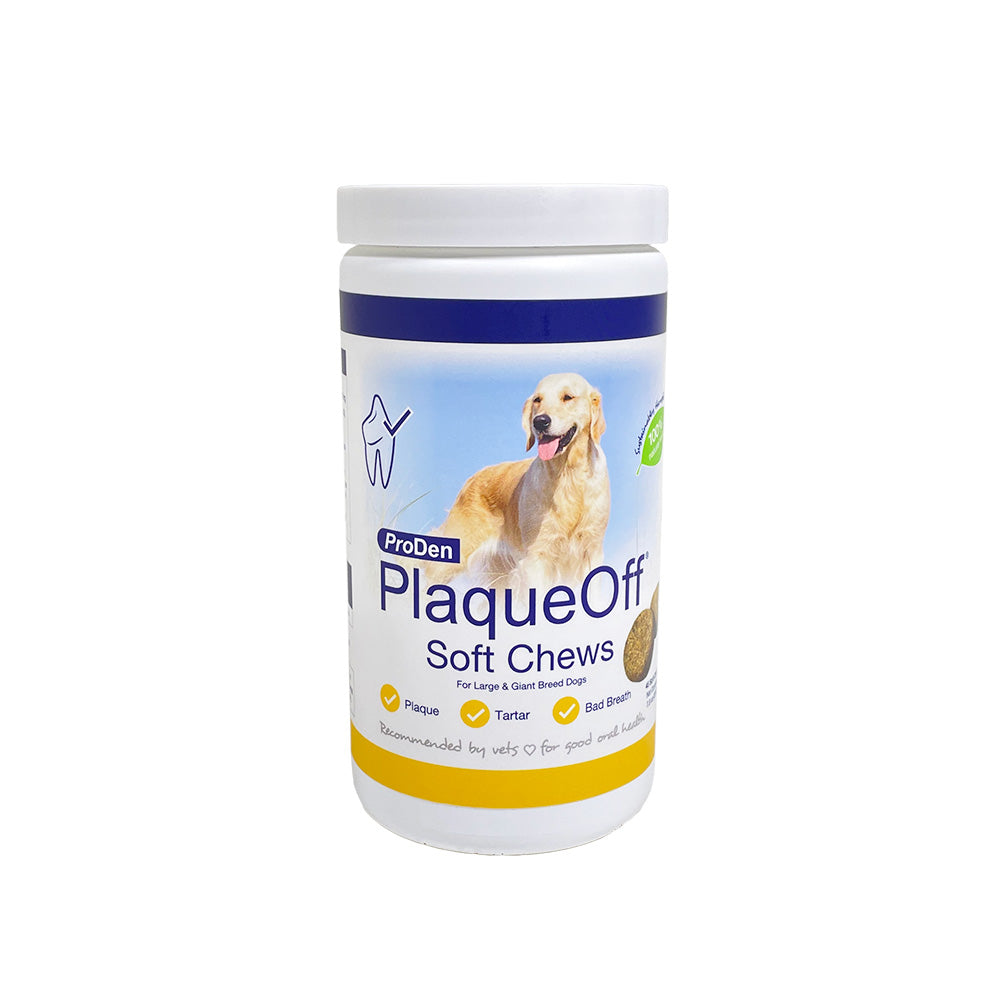 Plaque-Off Large Breed Soft Chew 45 CT, the latest innovation from ProDen PlaqueOff® designed specifically for your large and giant breed dogs. These soft chews feature the natural power of A.N ProDen™, derived from specially selected sea kelp, clinically proven to combat plaque and tartar buildup while promoting fresher breath with regular use. Each chew is packed with 660mg of A.N ProDen™, combined with wholesome ingredients like brewers dried yeast, canola oil, and natural flavorings for a delicious treat your dog will love.