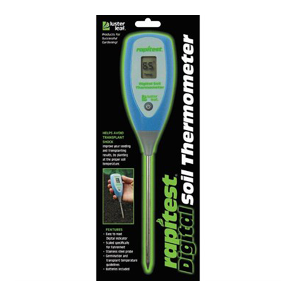 The Rapiclip Digital Thermometer improves seeding and transplanting results by planting at a safe and proper soil temperature. Easy to read digital results. Scaled specifically for soil temperature readings in Fahrenheit. Stainless steel probe. Guidelines for germination and transplant temperatures are included. Batteries included.