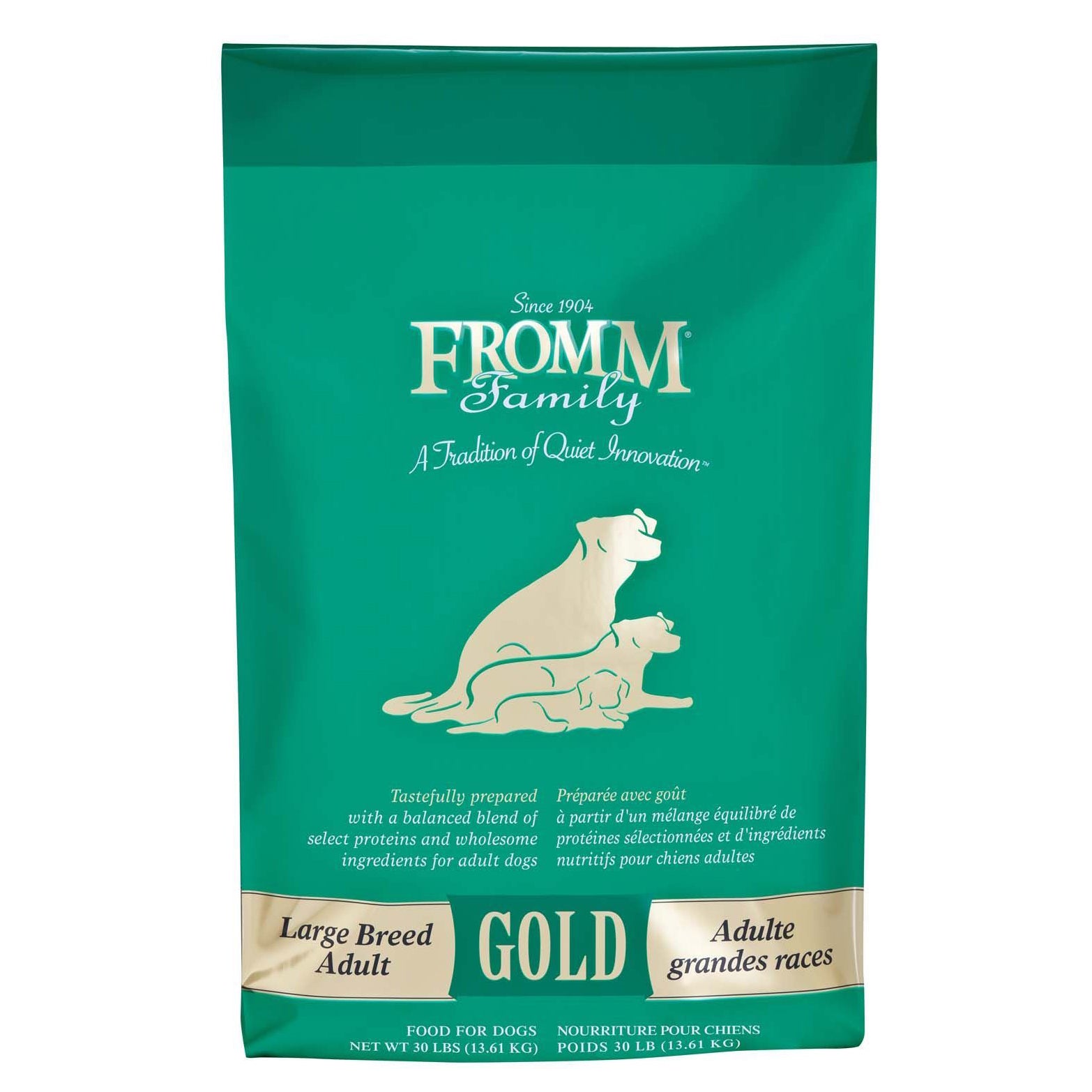 Fromm Gold Large Breed Dog 30 LB, a premium canine nutrition option designed with a holistic approach to cater to the unique needs of larger breeds with adult weights exceeding 50 pounds. Crafted at our family-owned facility in Wisconsin, this exceptional dog food is available in three delightful variants – Fromm Heartland Gold (grain-free red meat), Fromm Gold Coast (grain-free ocean fish), and our original Fromm Gold (poultry-based).