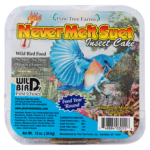Pine Tree Farms NeverMelt Insect Suet 13 OZ is produced with some of the finest ingredients. We never use artificial pellets or artificial berries, making these Never Melts the best in the world. We have a special formula that creates a “never melt” suet that is unmatched by anybody in the business and we only use top-quality seeds, grains, peanuts, and fruits to attract a larger variety of wild birds.